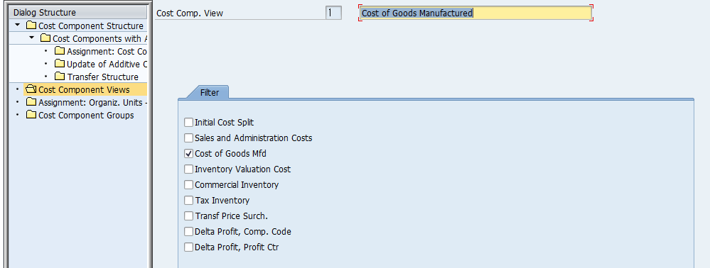 원가 구성요소 세부 정보와 원가 구성요소 뷰 사이에는 9개의 대응되는 필터 기준(Filter criteria)이 있습니다. 원가구성요소 뷰를 매핑하기 위해 첫 번째로 해야 할 작업은 아래 [화면 1]에서 Filter criteria를 정의하는 것입니다. SAP 시스템에서는 Filter criteria를 기준으로 원가구성요소 뷰 속성을 정의합니다.