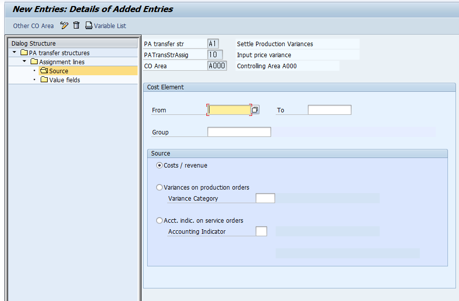 Source 탭에서는 어떤 원가 요소(Cost Element 또는 그룹)를 전송할 지 정의합니다.