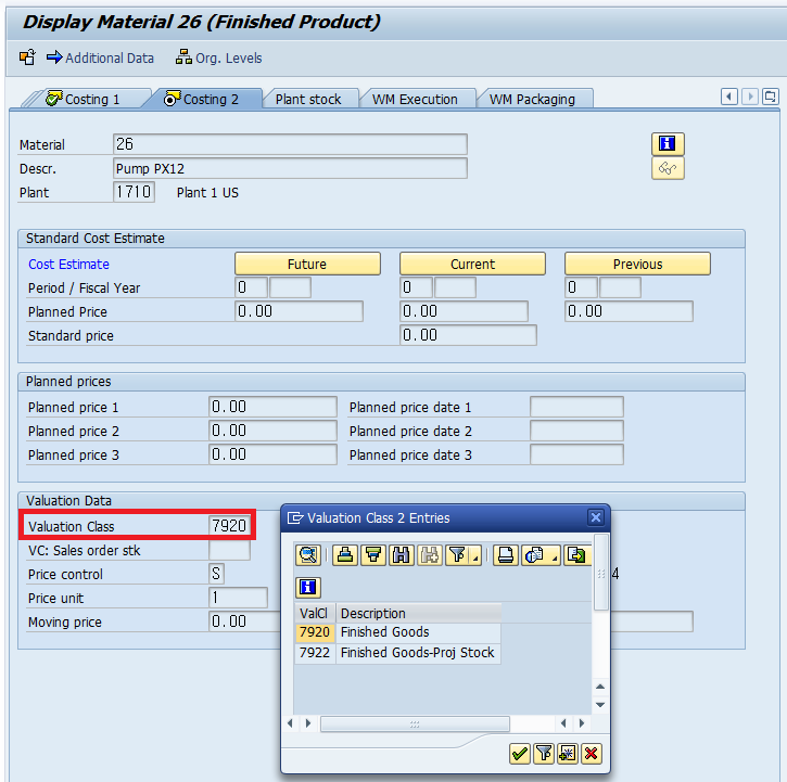 MM Account determination에 가장 주요한 키인 평가 클래스는 자재 마스터 Accounting 1 또는 Costing 2 뷰에서 확인할 수 있습니다. 아래 예시에서는 7920인 경우 제품으로 분류하고 있습니다. 참고로 평가클래스는 4자리 숫자로 표기합니다.